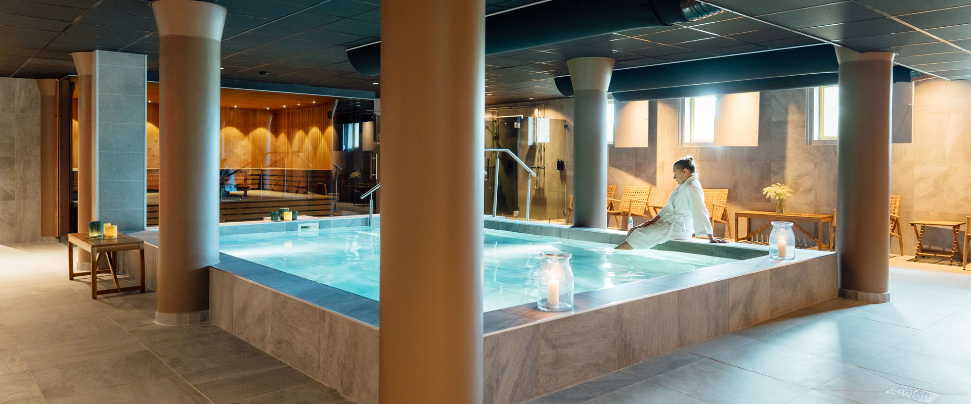 Slappna av i vår spaavdelning med 2 bastur, relaxpool och relaxyta med bekväma sittplatser